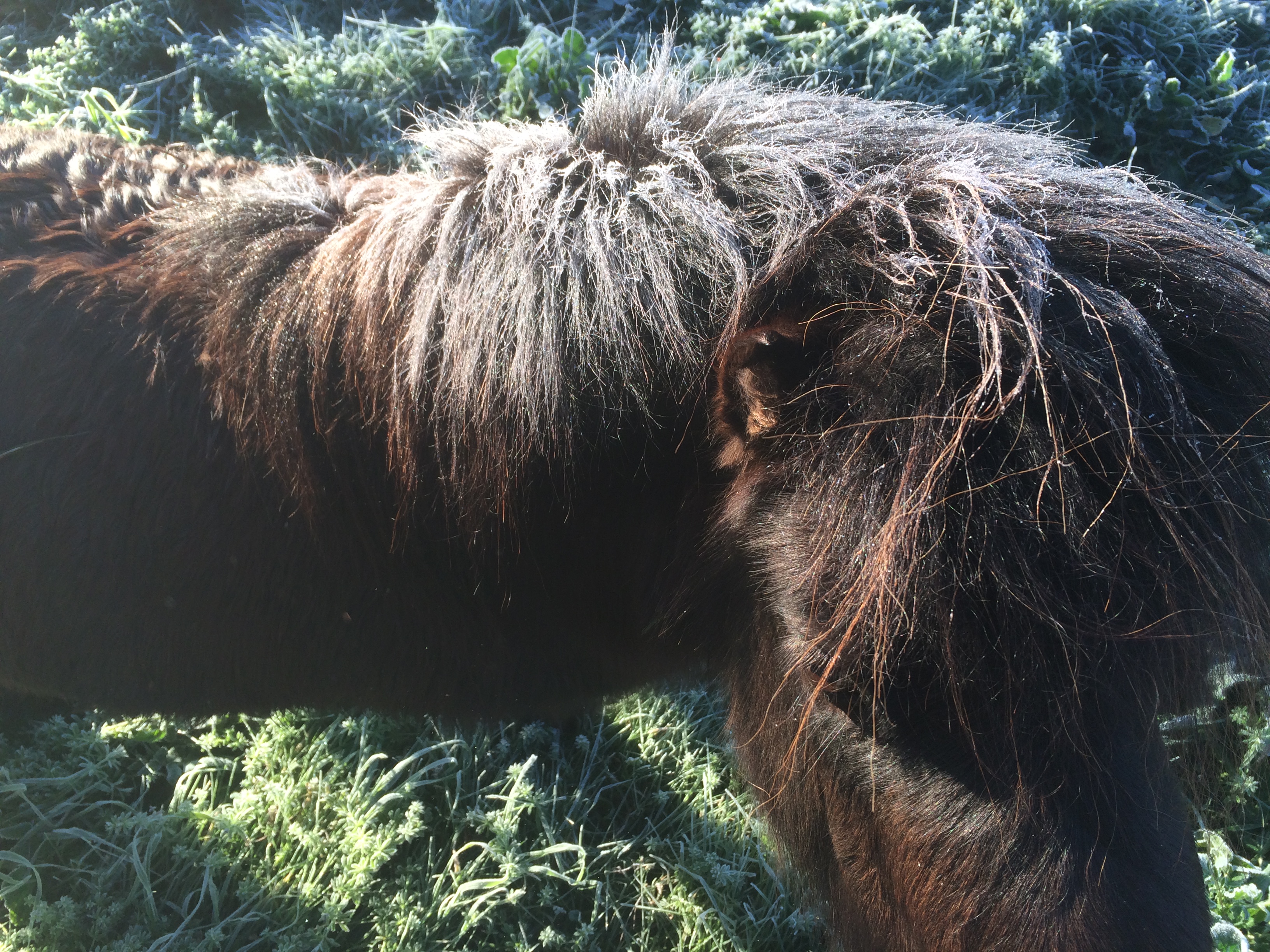 The sun is SO BRIGHT AND BEAUTIFUL and helping to melt the frost off every surface including Shorty’s mane & beard, he was a cold and grumpy boy!!